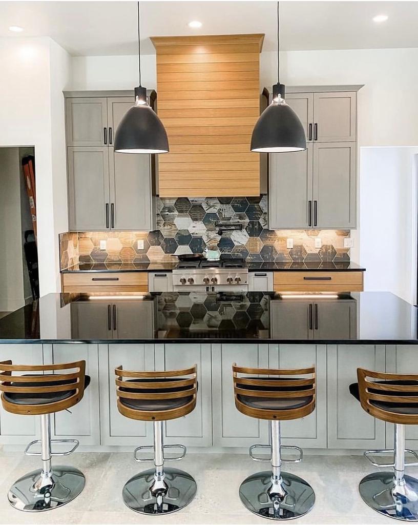 La mesa en tonos oscuros aporta sofisticación, mientras que la cocina resalta por su frescura y diseño actual.